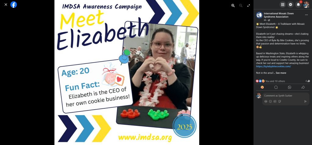 Our mission is to raise funds to create a National mosaic Down syndrome Day specifically for the education and expression of people with mDs who are only 2-3% of Ds people.